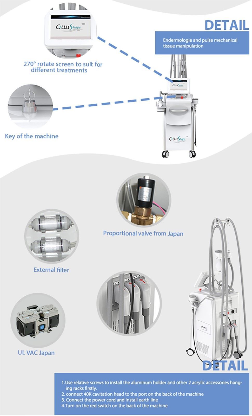 cellushape is updated from LPG and VELASHAPE for cellulite removal, body sculpting, and skin tightening. five core techniques: IR(Infared Light), RF(Bi-polar radiofrequency) and Vacuum, Cavitation and auto roller. four handles and five heads. using the best parts from USA and Japan.All body area can be treated.