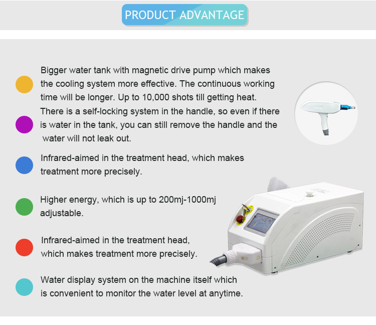 3.Imported stone Q-switch cassette mechanism, the entire solid laser, ithout replacing Q-switch. 4.Painless treatment, little side-effect.