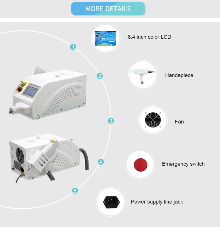 Q-Switched ND YAG model, the equipment uses laser to emit high energy instantaneously whichsmashing the pigment of pathological tissues, namely the laser leading explosive effect: High energyemits instantaneously, making particular wavelength laser penetrating epidermis and getting intopathological pigment tissues in only 6nms.