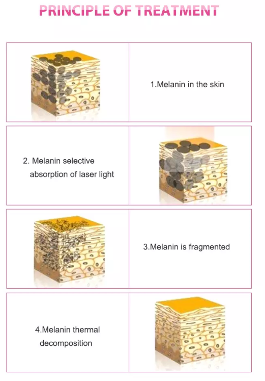 Utilizing the explosive effect of the Nd: YAG laser, the laser permeate the epidermis into the dermis which includes amount of pigment mass. Since the laser pulses in nanosecond but with super high energy, the shot pigment mass swell quickly and breaks into small pieces, which will be eliminated through metabolic system.