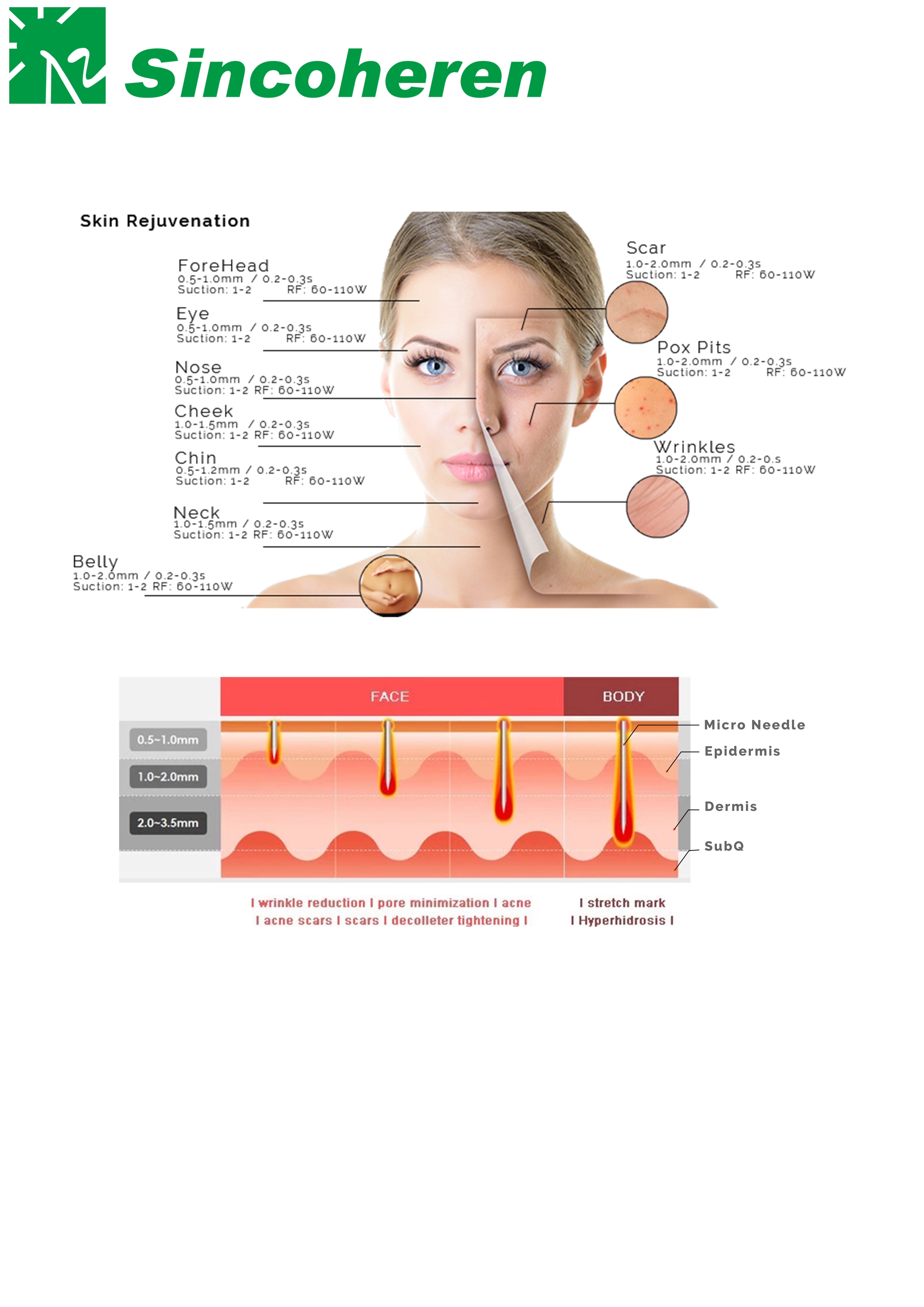 Fractional RF Needle System through the special design of many fractional needles point array, the high speeddigital motor controls order through the epidermis and the dermis accurate to control the depth of 0.25-3mm, againby the end of the lattice needle release RF, stimulate collagen and elastic tissue, and is the epidermal layer is safeRF energy can well to penerrate to the dermis, stimulate collagen protein hyperplasia, not only is the best way toimprove the scars, but also long-term tightening skin wrinkles induced the good method.