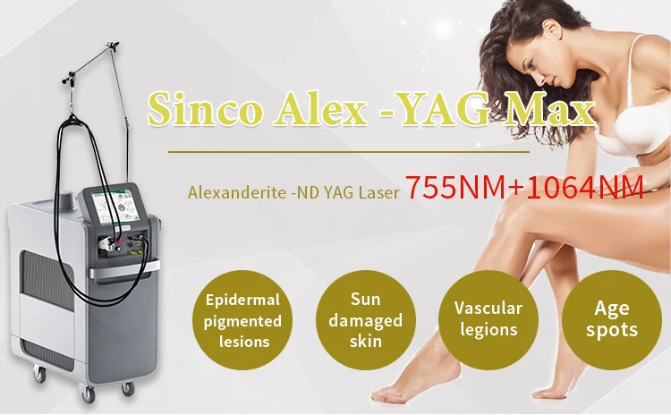 The Sinco Alex-Yag Max is a single consolidated system that delivers a range of treatments - all skin type hair removal, as well as pigmented and vascular lesions. It is a dual wavelength laser platform that combines the fastest and most powerful 755 nm Alexandrite laser with the 1064 nm Nd:YAG laser for high performance treatment capabilities in terms of speed, efficacy, ease-of-use, outstanding performance, safety and patient satisfaction.