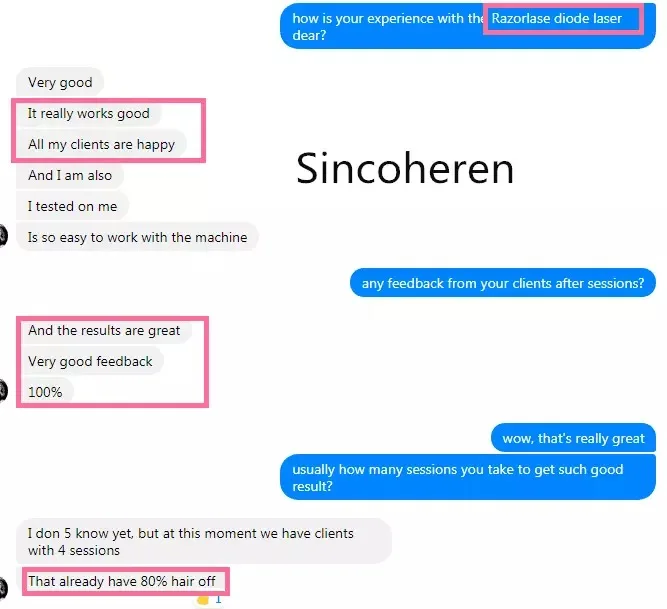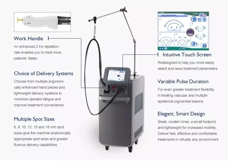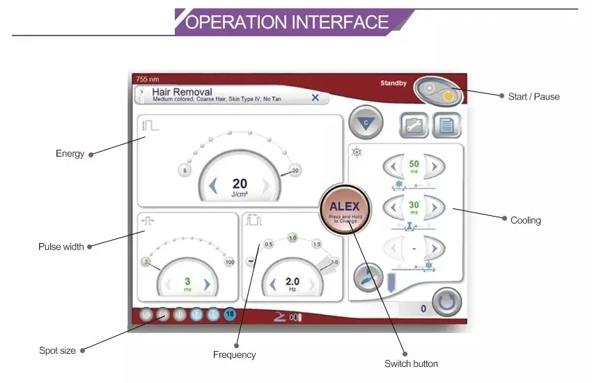 Advantage The Headpiece is fine designed, and the laser spot size can be adjusted from 8-16mm diameter, and a continuely headpiece cooling is cool the skin to get down skin tempreture, all that will enables the treatment much more convient, comfortable and efficient. The pulse width can be adjusted from 5-100ms, and the long pulse width can treatment the hair follicle more efficiently.So the headpice slids over the skin the same time the hair burns off. So a super quick hair removal can be achived. Compared with other devices for hair removal, pulse width can be selected to burn the hairs much more efficiently; and the spotsize can be ajusted by 8-16mm diameter, so the bikini hairs removal will be suitable and easy operate. Also the efficience is immediately and visiable, as through goggles (which is used to protect eyes.) the operate can see that the hairs burns into ashes.
