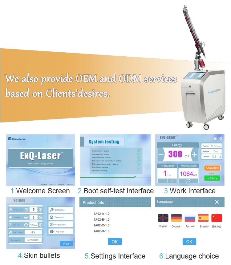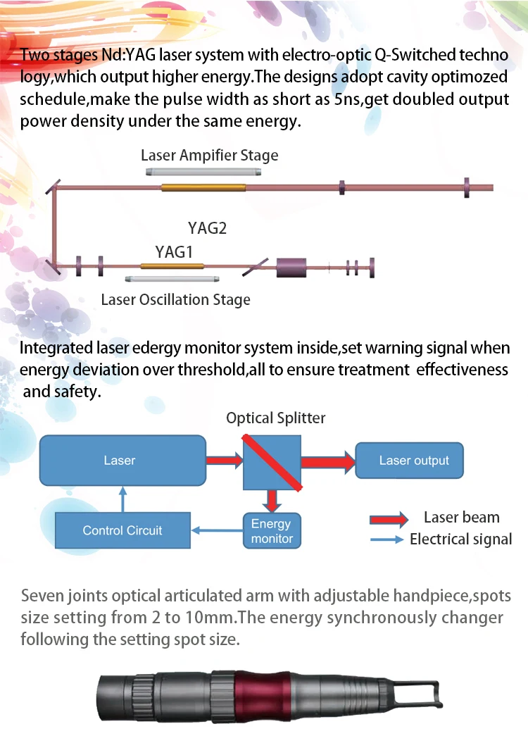 1.Flat-top hat Beam 2.7 joint articulate arm&10.4 touch display 3.Real-time energy monitor& Auto-Cali-bration System 4.Energy density is automatically adjustedwith spot size 5.Short pulse duration 5ns