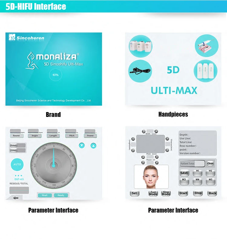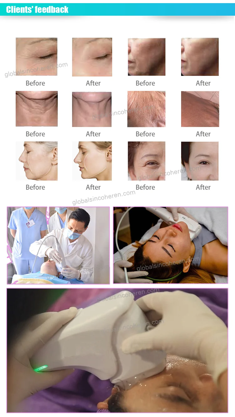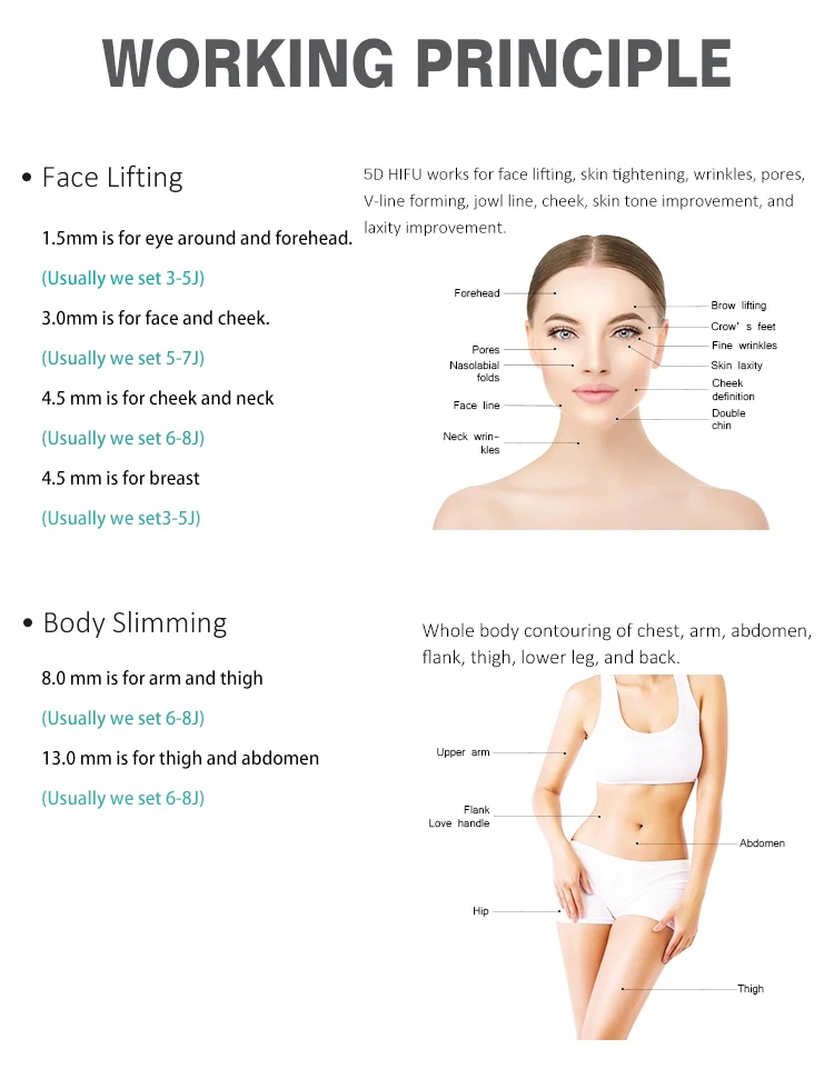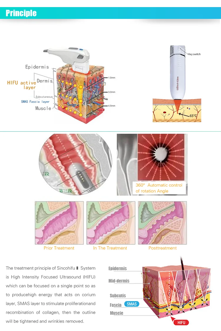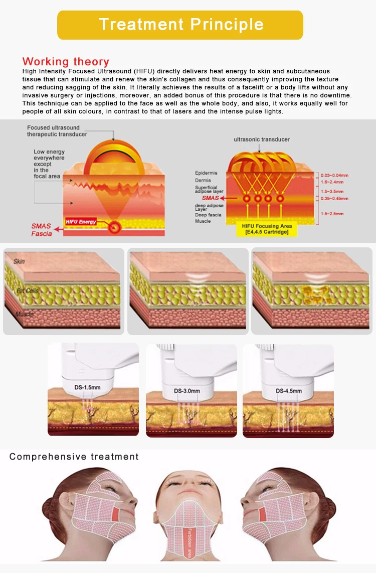 HIFU machine is an advanced new high-intensity focused ultrasound technology designed instrument, change the traditional face lift wrinkle cosmetic suigery, non-surginal wrinkle technology, the Hifu machine will release high concentrated focus sonic energy can penetrate in the deep SMAS fascia skin tissue and coagulation of high heat in the proper position, the deep dermis to stimulate the skin to produce more collagen and thus to tighten so the skin becomes former. hifu can directly delivers heat energy to skin and subcutaneous tissue that can stimulate and renew the skin's collagen and thus consequently improving the texture and reducing sagging of the skin.