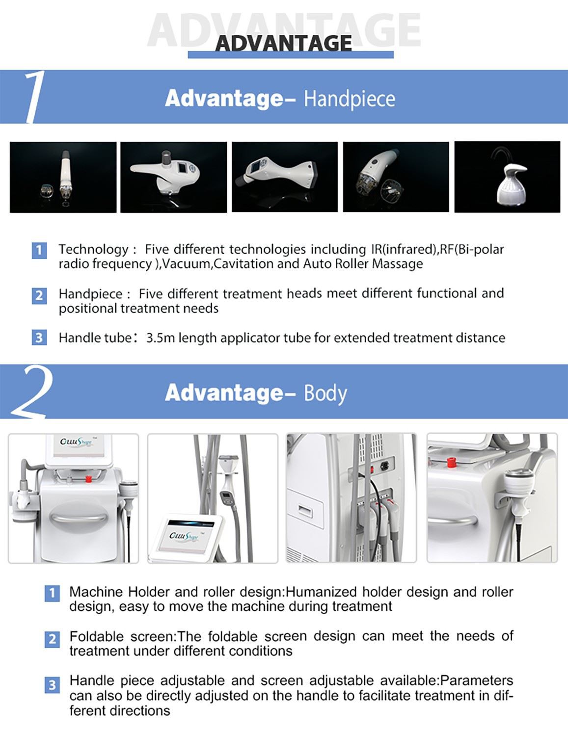 cellushape is updated from LPG and VELASHAPE for cellulite removal, body sculpting, and skin tightening. five core techniques: IR(Infared Light), RF(Bi-polar radiofrequency) and Vacuum, Cavitation and auto roller. four handles and five heads. using the best parts from USA and Japan.All body area can be treated.