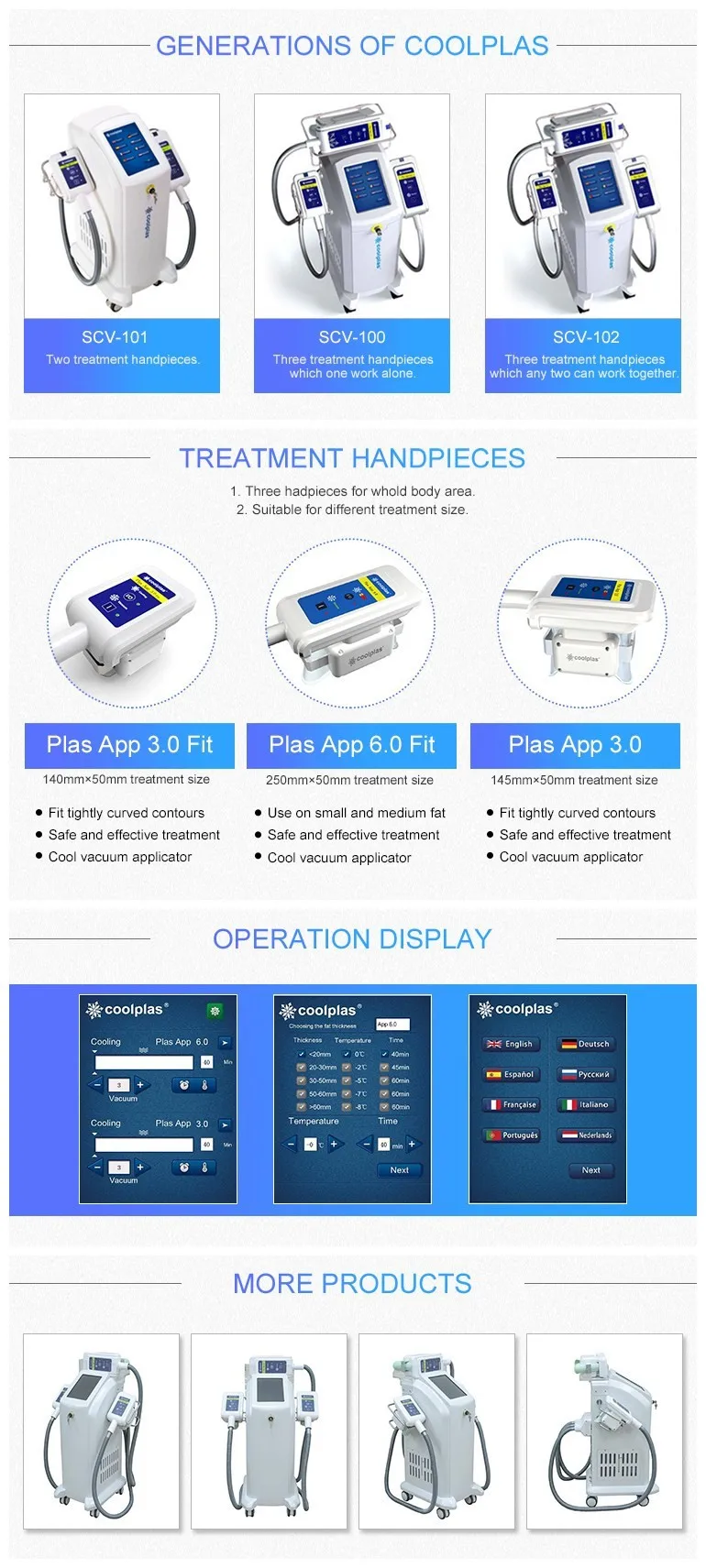 Advantages 1. First treatment can eliminate 26%- 40% fat 2. The latest technology in non-surgery mechanical beauty industry 3. 3 treatment handles and 2 handles could working simultaneously 4. One set coolplas device is equal to two sets old technology cryolipo machine. The cool slimming machine can help you reduce cost. It can be treated for 1~4 fat persons. 5.We have obtained patent technology and if you want be a distributor, your benefits will be protected