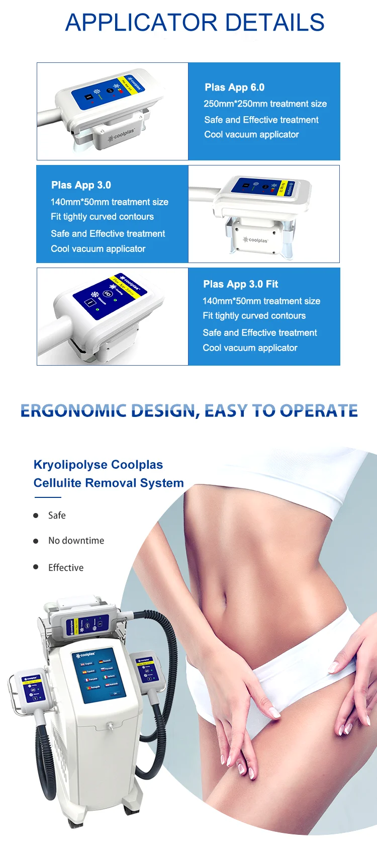 Our cooplas machine dissolves the excess fat by freezing, so as to achieve the effect of slimming. It has been sold for more than ten years, and it is very popular all over the world and has a lot of customers. Some advantages: 1.Hand tools: (1)Three hand tools, adapt to different parts. (2)The handle is equipped with a film button, which can be operated remotely, safe and convenient (3)Special ice film, adapt to different hand tools. 2. Host:(1)Two-handed and three-handed equipment, two models configuration. (2) Proportional valve-Japanese SMC brand, compared with ordinary solenoid valve, low noise, fast response speed, accurate control (3)Vacuum pump—Japan ULVAC brand (4) The host is small and exquisite. 3.program: (1) 10.4-inch vertical screen, multi-language preset, easy to use (2) Safety protection function (water flow, over temperature) (3)Precise temperature control, accuracy 0.1 (4)Precise negative pressure control, comfortable treatment. (5) According to the clinic, according to the thickness of different adult layers, preset 5 treatment modes. The doctor can also adjust freely according to the actual situation. (6)Can be customized by OEM, with dual handles working at the same time. If you are also interested, welcome to ask me for some information. My whatsapp: +8613716693761, thanks very much!