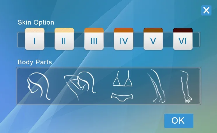 6 skin types, 5 treatment areas, total 30 clinical default data for reference, 10HZ frequency fast treatment.