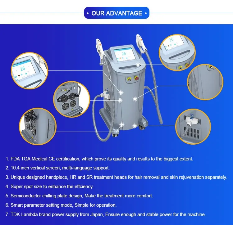 IPL SHR system for hair removal, skin tightening pigmentation remove With K123435 and Eorope CE approved. For permanent hair removal, skin rejuvenation and vascular removal. SHR IPL system. With many distributors all over the world. Suggesting 30 units clinic parameters to operate. Main spare parts are imported, with high quality. The most popular muti function aesthetic machines.