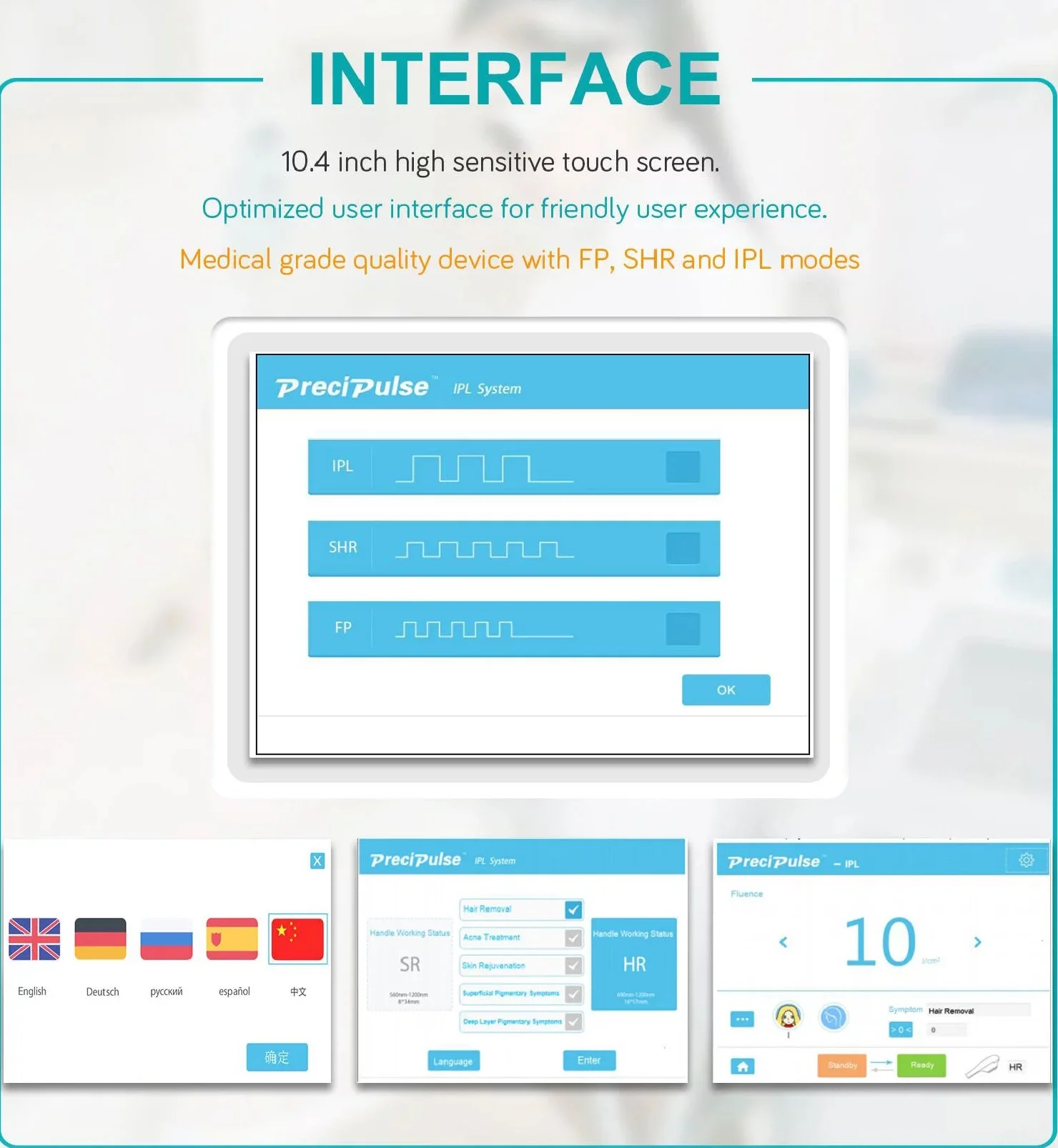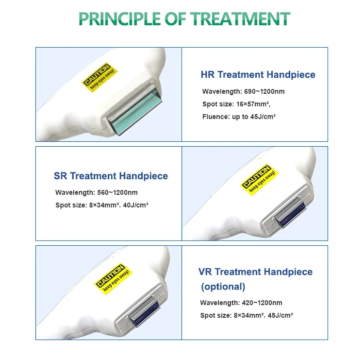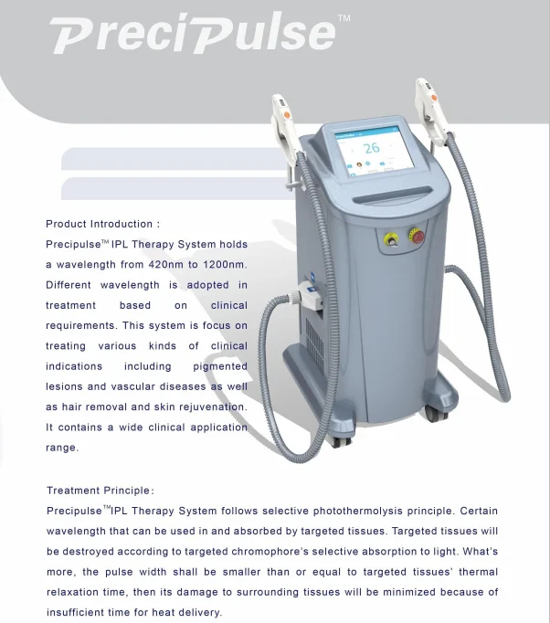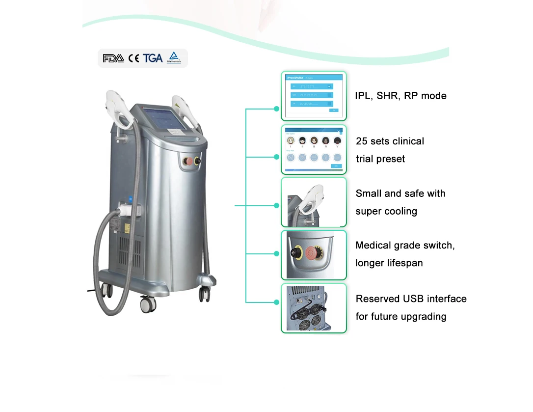 Our FDA. TUV, TGA, ISO and medical CE approved IPL machine has three handles, SR handle for skin rejuvenation treatment, HR handle for hair removal treatment, and an optional VR handle for vascular removal treatment. Comapred to other IPL machines on the market, our machine has many advantages: 1.Xenon lamp imported from England 2.Metal handle support holder, more powerful support handle 3.Smart handle design: exactly control output energy 4.Medical grade equipment with three modes of FP, SHR and IPL on the interface, more convinient to choose. My whatsapp number:+8613716693761 pls feel free to contact me for more details if you are interested, thanks very much!