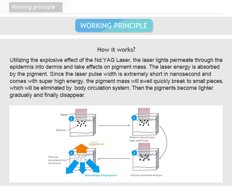 Q-Switched ND YAG model, the equipment uses laser to emit high energy instantaneously whichsmashing the pigment of pathological tissues, namely the laser leading explosive effect: High energyemits instantaneously, making particular wavelength laser penetrating epidermis and getting intopathological pigment tissues in only 6nms.