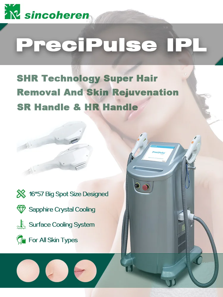 Advantage 1. Many interchangeable durable sapphire filters, suitable for option applying to different applications and skin types, have excellent cooling result. 2. New silica gel tailstock of the machine handlepiece, will not leak any water when replacing handle piece, much more beautiful and durable than before. 3. Have the alert device for conk out of water level, water temp, water flux and refrigeration 4 Remember system and Reset function ease for medical or esthetic institutions to decrease cost 5. Professional and modern design; Elegant appearance, competitive price and perfect after-sale service 6. Long continuous work time, stable function, shot period of treatment, easy operation, no down time, delivery in time without delay. 7. SHR machine is with Single pulse mode can emit energy averagely, however, IPL machines are with Multi-pulse mode which focus energy on first pulse, which is very easy to burn patients. 8. SHR filtered violety light and infrared light, which will eradiate and absorb water from target skin. So SHR costnot have any side-effect to body. 9. With DEC technology. Indentified function makes operation simple, and makes treatment safely. 10. With bigger frequency (from 1 to 10 Hz). Which accelerate operation speed and short a lot of time for treatment. 11. Intelligence, stable operation, simple and beautiful.