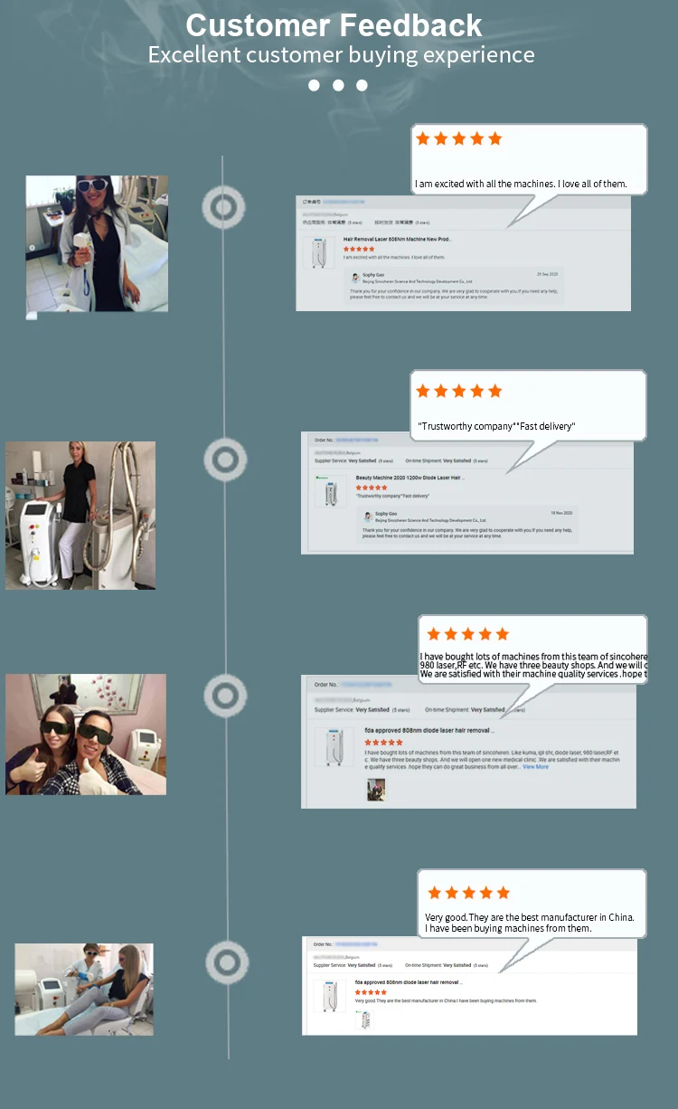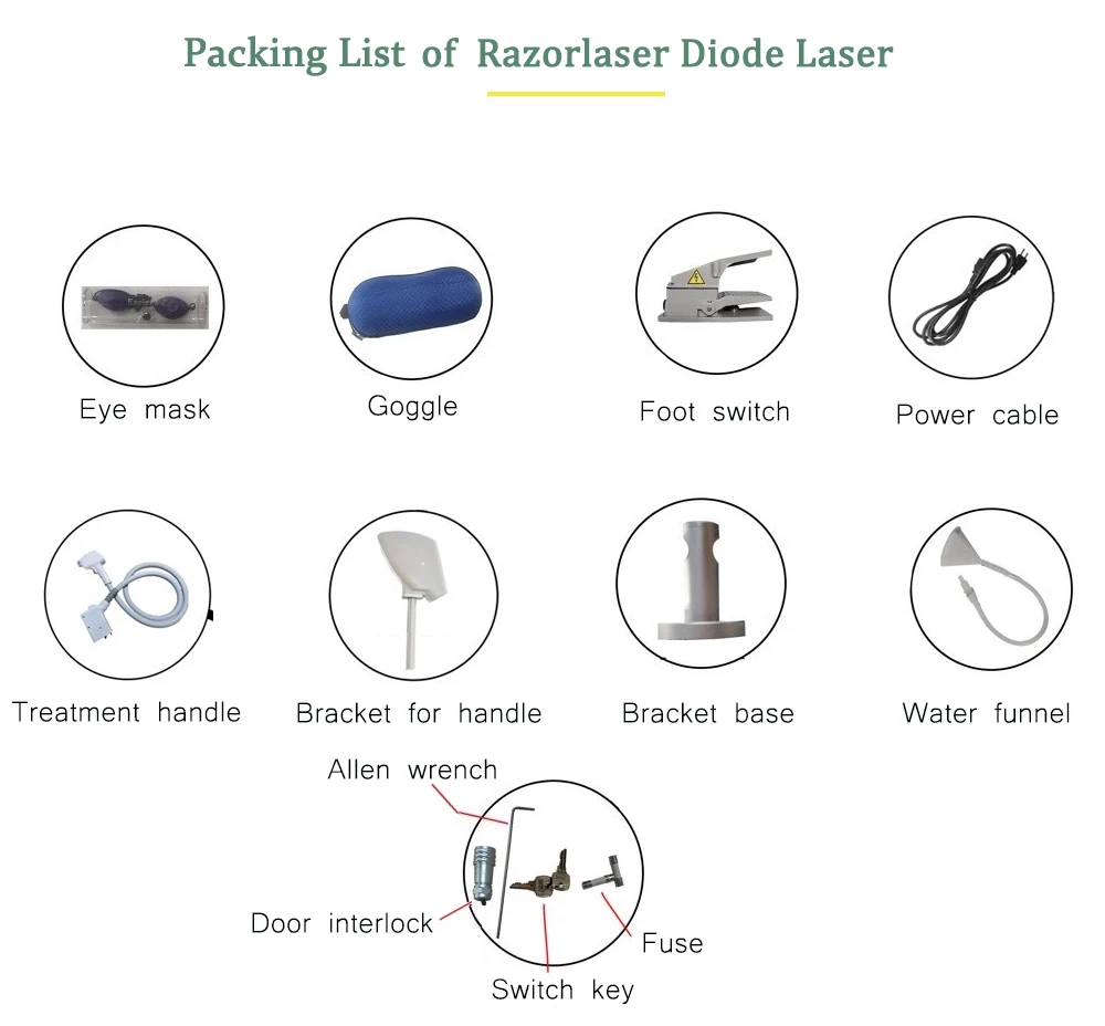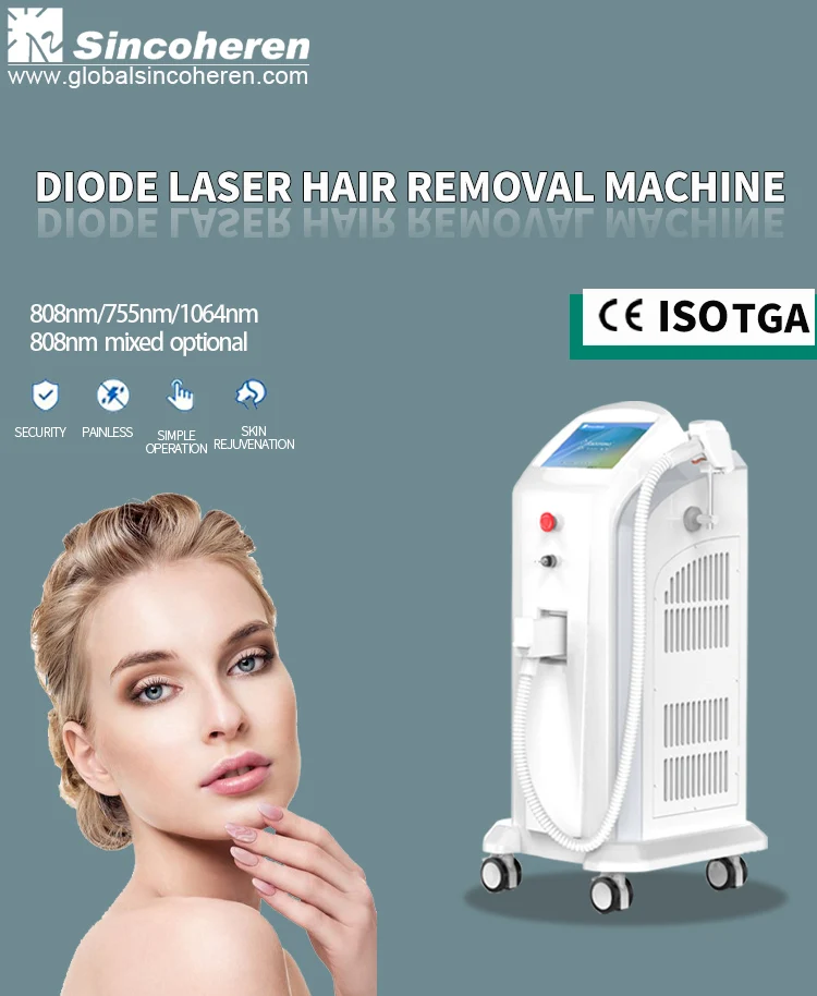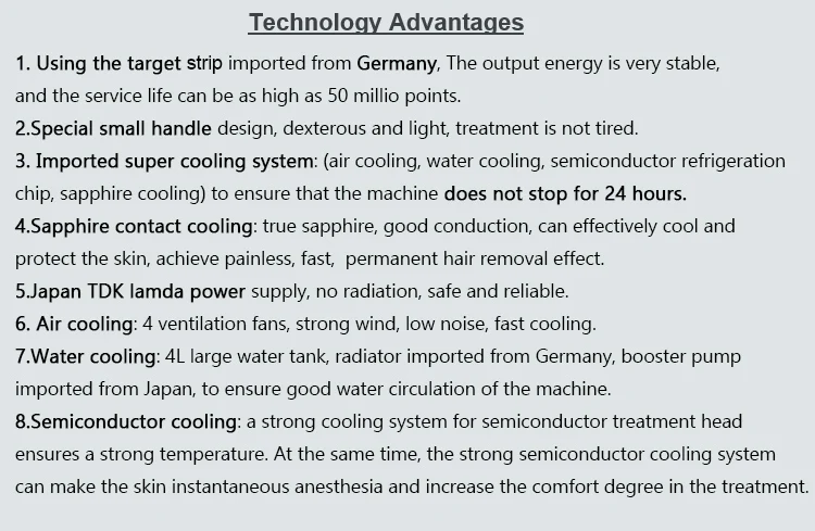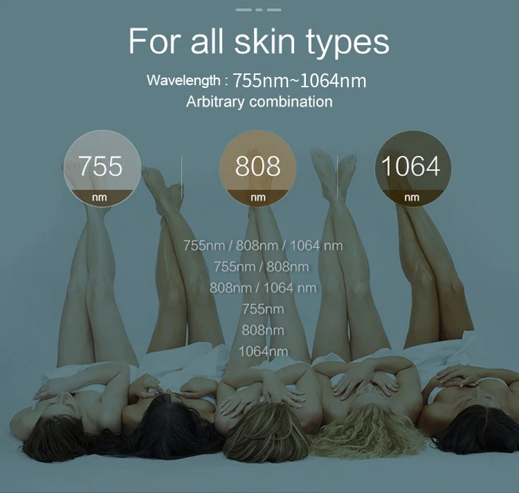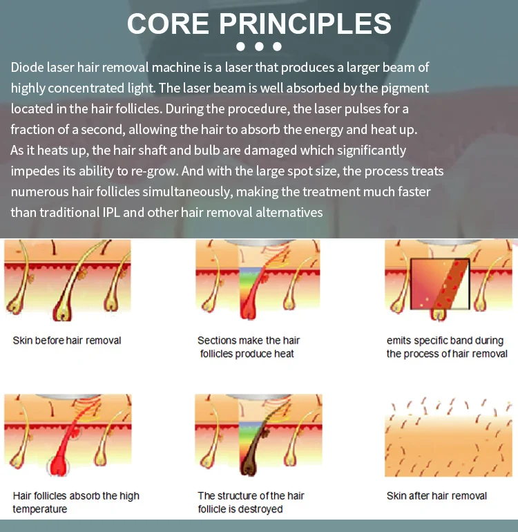 Basing on the selective light absorption theory, we let the diode laser generated by laser hair removal machine pass through the skin surface and penetrate the hair follicles by adjusting the wavelength, energy, and the pulse width to realize the hair removal purpose. In the hair follicle and hair shaft, there are plentiful melanin spreading between the follicle matrix and moving to the hair shaft structure. Once the melanin has absorbed the energy of laser, it will show a sharp rise in temperature and lead to destroy upon the surrounding follicle tissue. In this way, the unwanted hair will be removed completely.