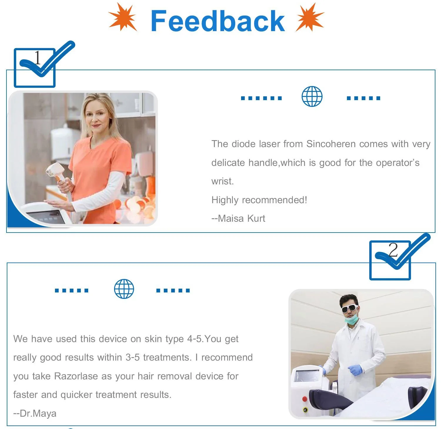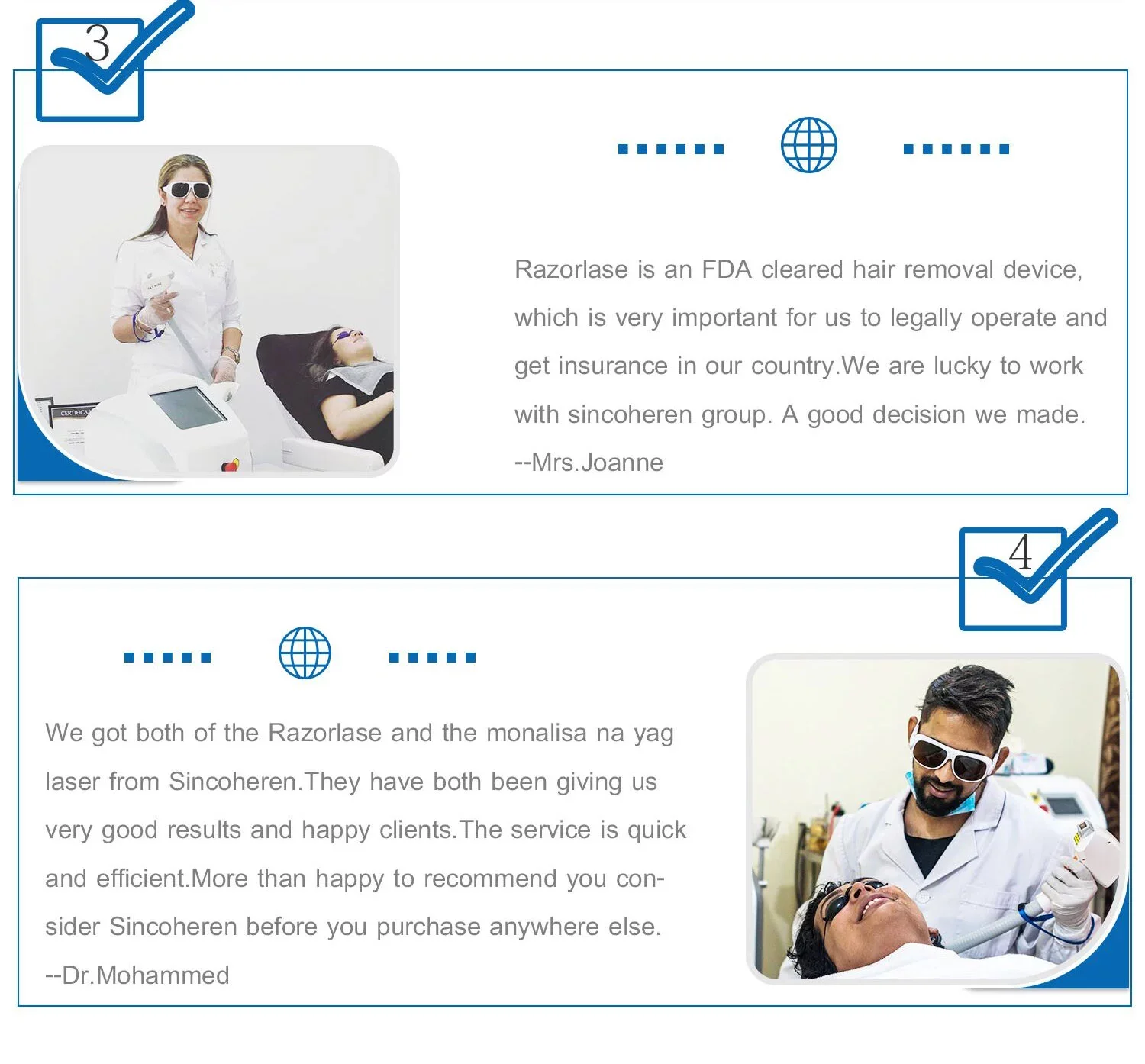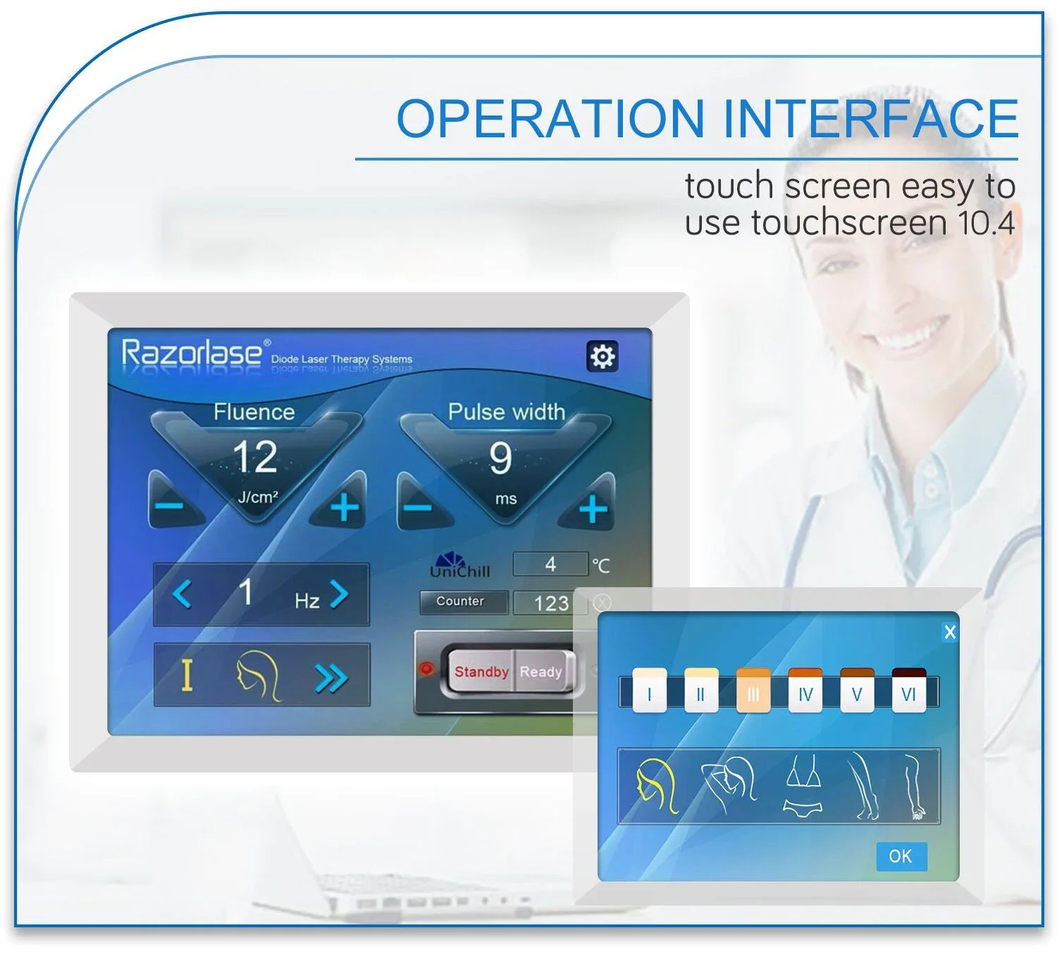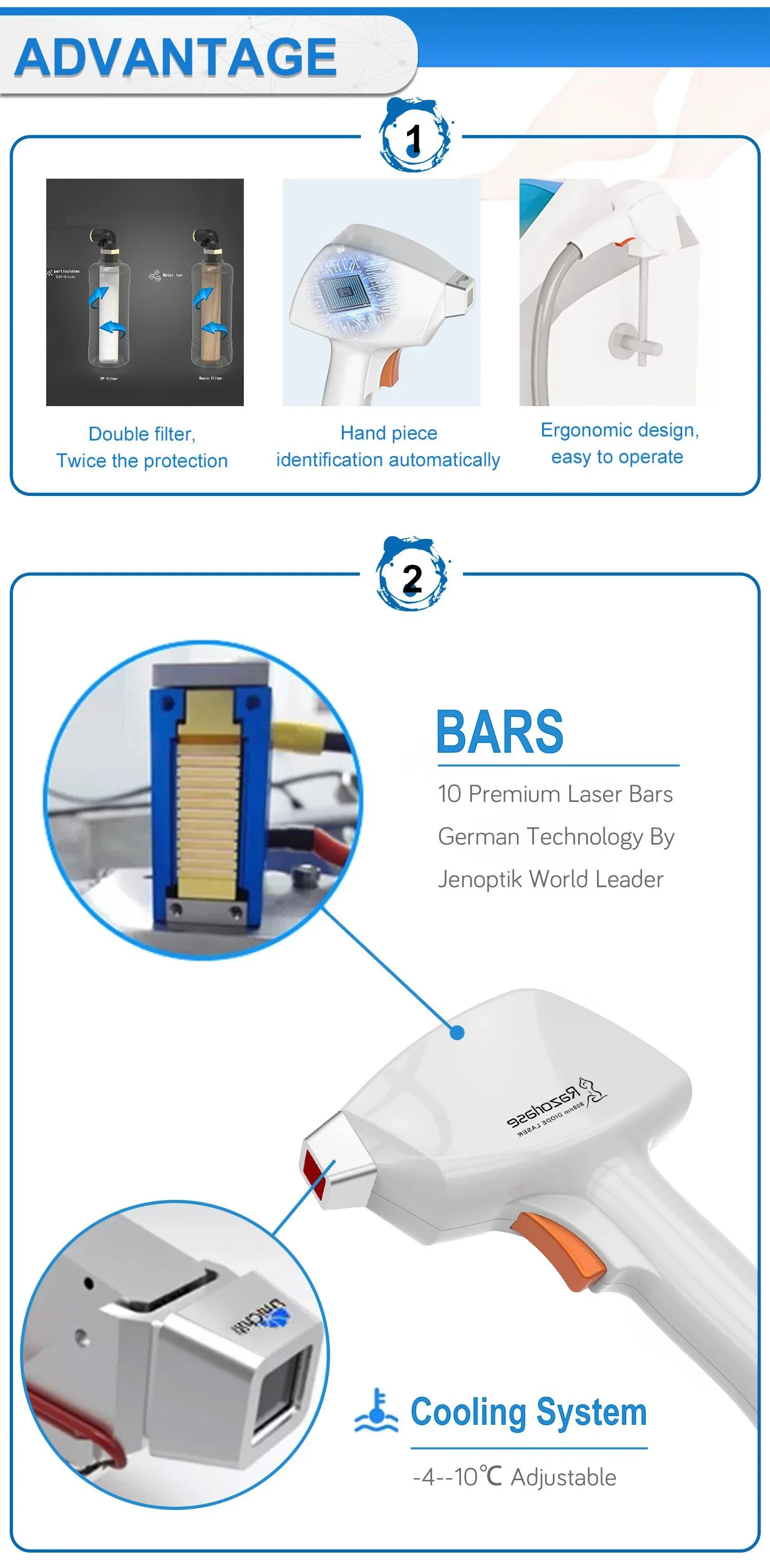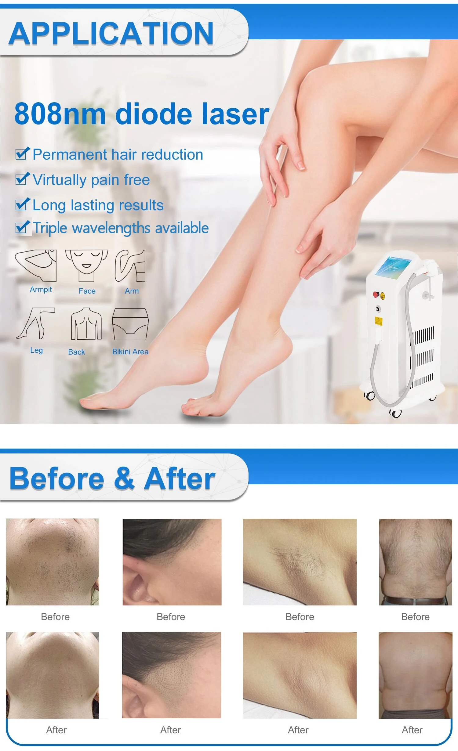 Advantages: * Its treatment is non surgical, no down time, no blooding, safe and effective. * The operating is easy and the effect is obvious In this system, there are 6(I~VI) skin type for option, based on the skin color, appropriate parameters are set by the system, easy to operate for a new operator and make sure more effective and safe for specific skin type, best results about 3~6 sessions hair removal completely, according to different patients, 4-8 weeks apart. * It has three cooling systems, ensure patients safety and comfort, painfree feeling, providing continuous contact cooling of the epidermis. * The laser bar is from Germany Jenoptik Diode Lad GmbH, medical level power supply imported from Japan TDK-Lambda and the the water pump from USA flojet, this makes the machine work continously long time and bring good feeling for clients.