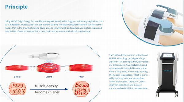 Muscle thinness uses HIFEM (High-Intensity Focused Electromagnetic Field) high-intensity focused electromagnetic wave technology, high-energy concentrated electromagnetic waves penetrate up to a depth of 7cm muscle layer, stimulate muscle motor neurons, trigger a continuous contraction of autologous muscles, perform extreme training, so that muscles can Deep remodeling, that is, the growth of myofibrils (muscle growth) and the production of new collagen chains and muscle fibers (muscle hyperplasia), thereby training and increasing muscle density and volume.