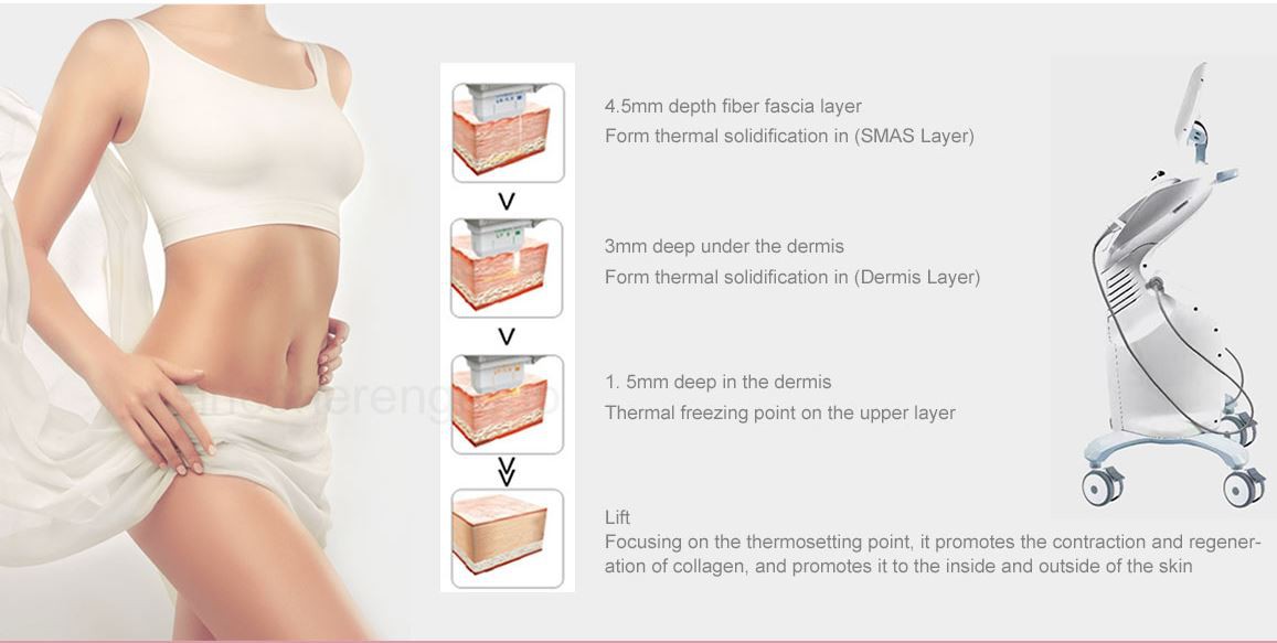 • Ultrasound Therapy, (HIFU) delivers focused ultrasound energy to the same foundational layer (SMAS) typically addressed by surgeons during cosmetic surgery. • Unlike lasers, radio-frequency and other devices, HIFU bypasses the surface of the skin to deliver energy at optimal depths. • Results occur instantly however best appear over two to three months as new collagen builds, gradually lifting and tightening the skin. • Slimming process continues for up to 6 months post treatment.